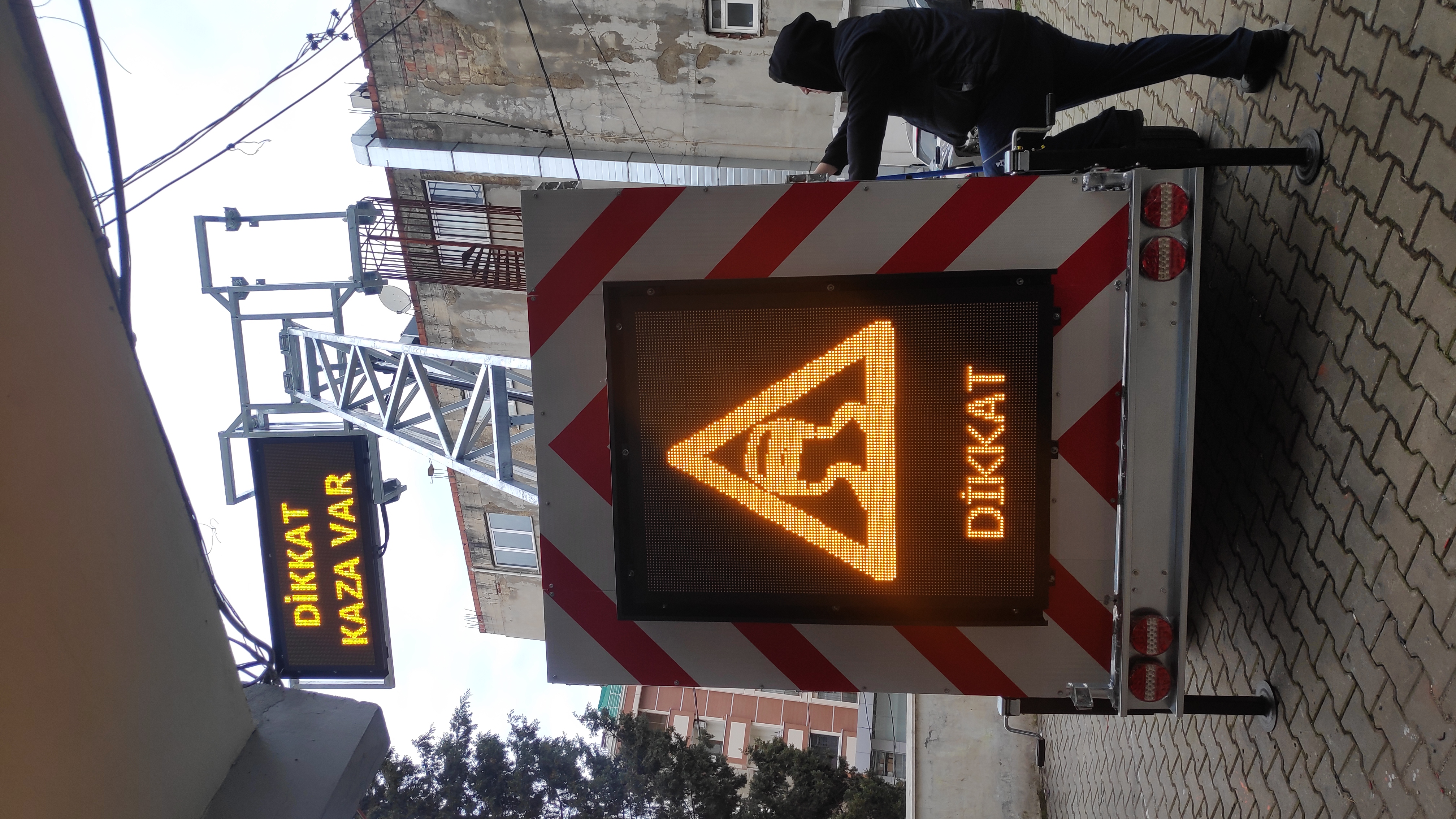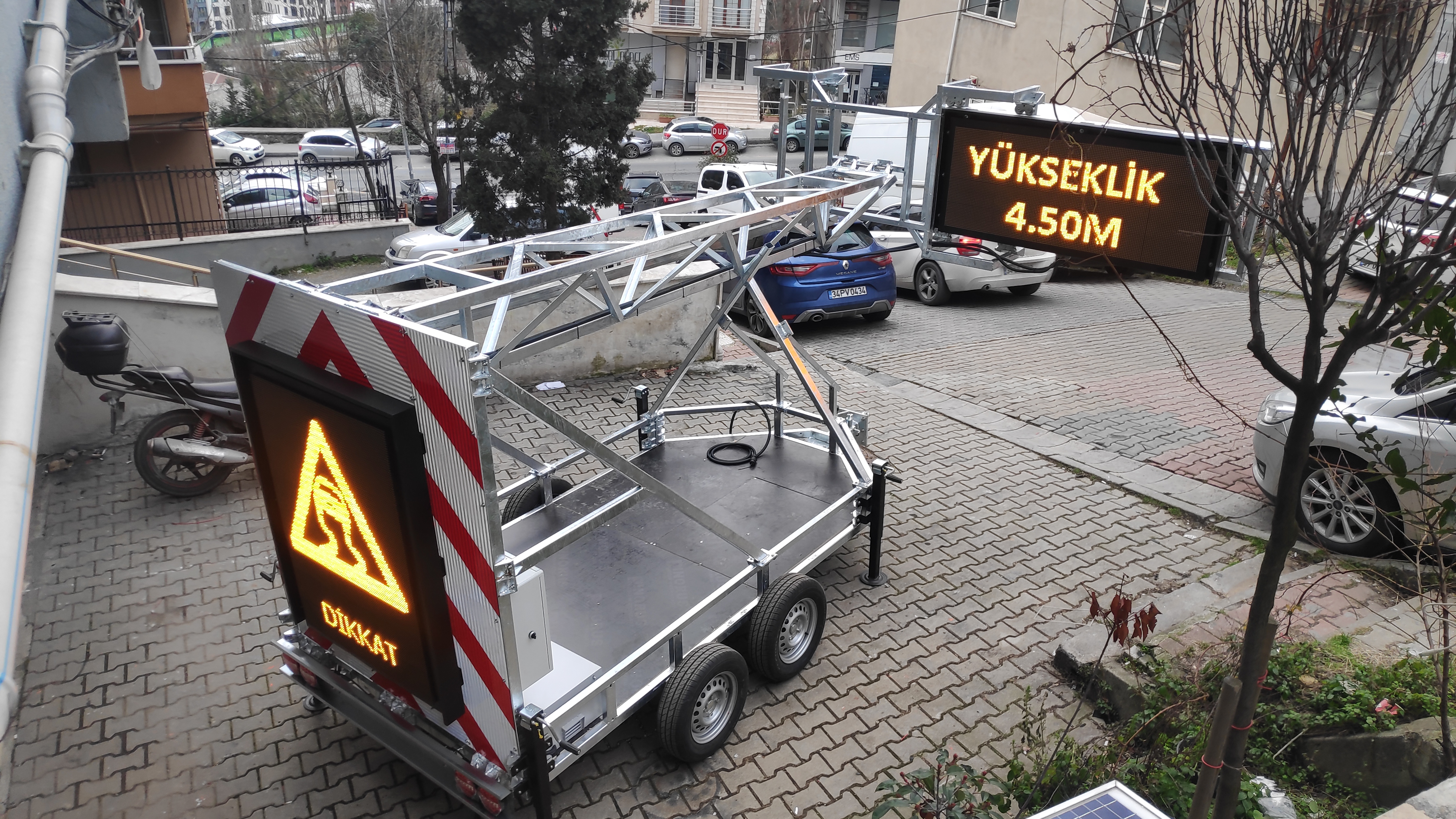 -There are 2 VMS screens on the upper and lower rear of the traffic warning trailer.