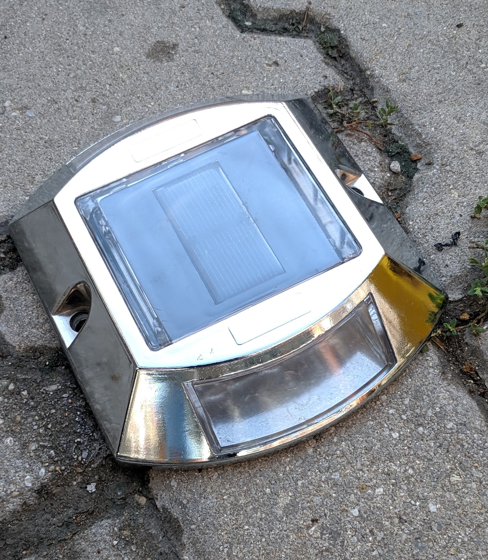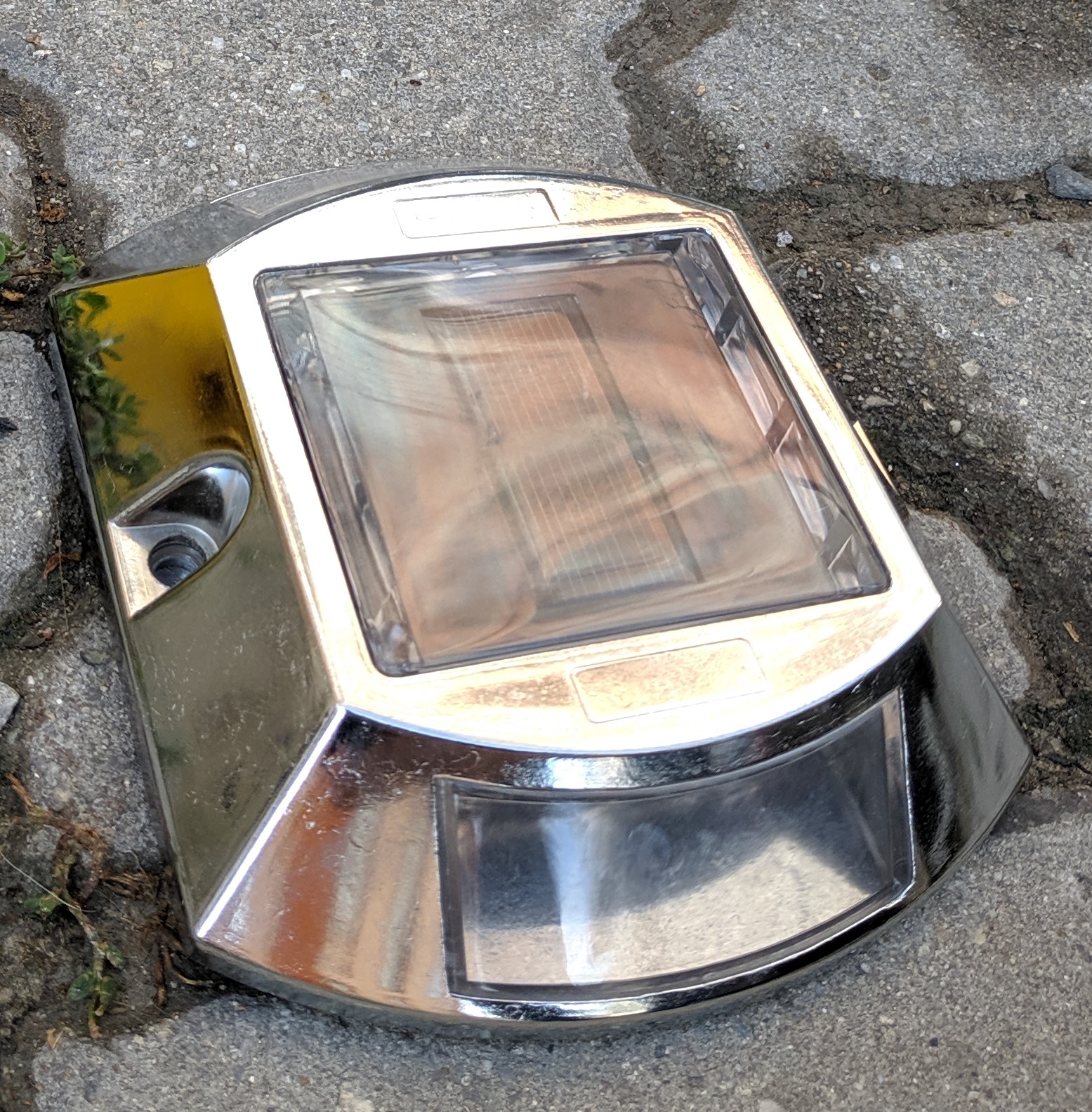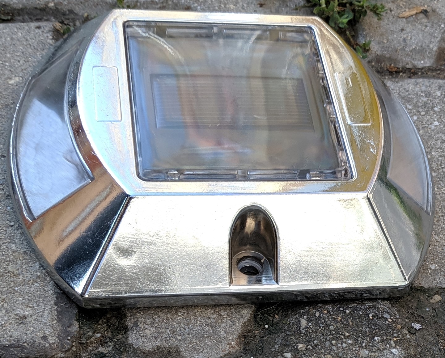 Güneş enerjili yol butonu, Metal malzemeden üretilmiş olup, ölçüleri 12.5x14.5 cm ebadında kare şeklindedir. Ürün yüksekliği 2.8 cm'dir Ağırlığı 480 gram olup, yüksek tonajlı geçişlere özel olarak tasarlanmıştır. Ürünün 2 tarafında, solar led'ler yer almaktadır. Toplam 6 adet led bulunur.